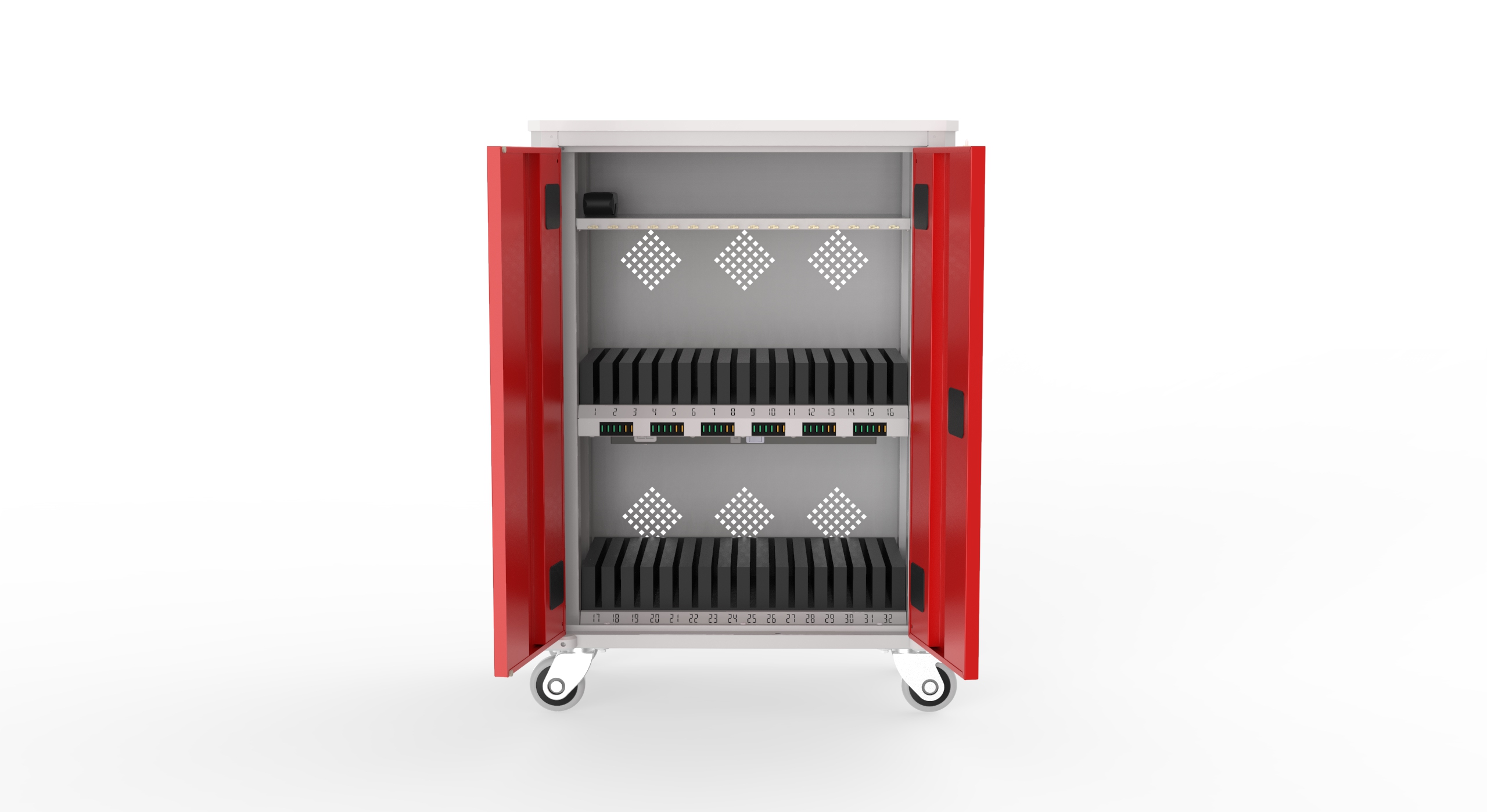 Wózek posiada funkcję szybkiego ładowania baterii oraz służy do przechowywania i łatwego przewożenia 32 szt. tabletów. Wózek posiada również dodatkowe gniazdo do ładowania laptopa.