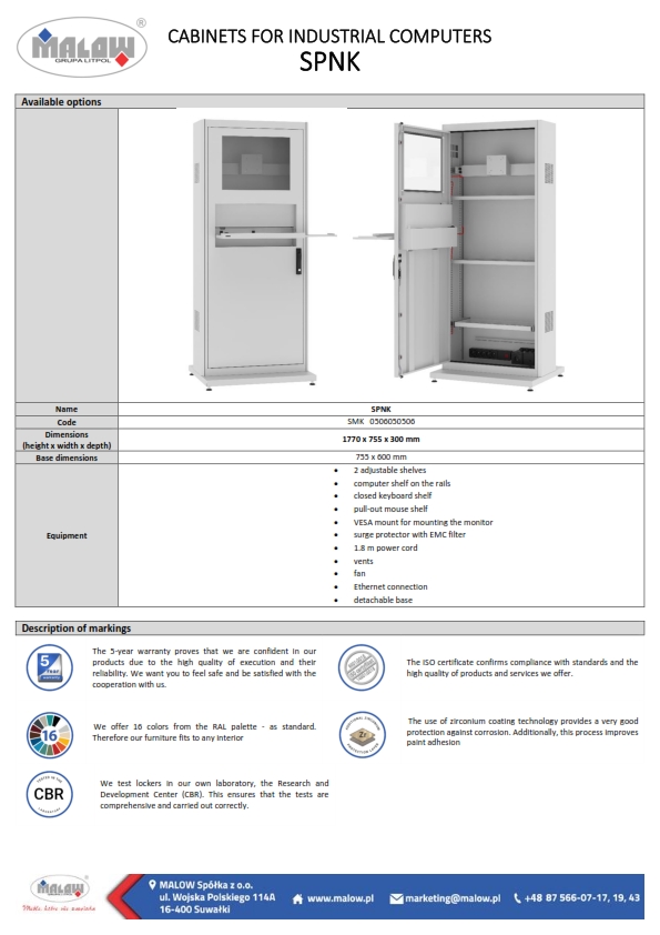 Our industrial computer cabinets have the IP42 rating. These high-quality products protect stored devices against harsh industrial conditions. SPNK cabinets fit to the majority of computers. The universal VESA mount allows to mount monitors up to 22”. As a standard, the cabinets have a power cord and overvoltage protection. You can learn more about SPNK cabinets from the catalogue card.